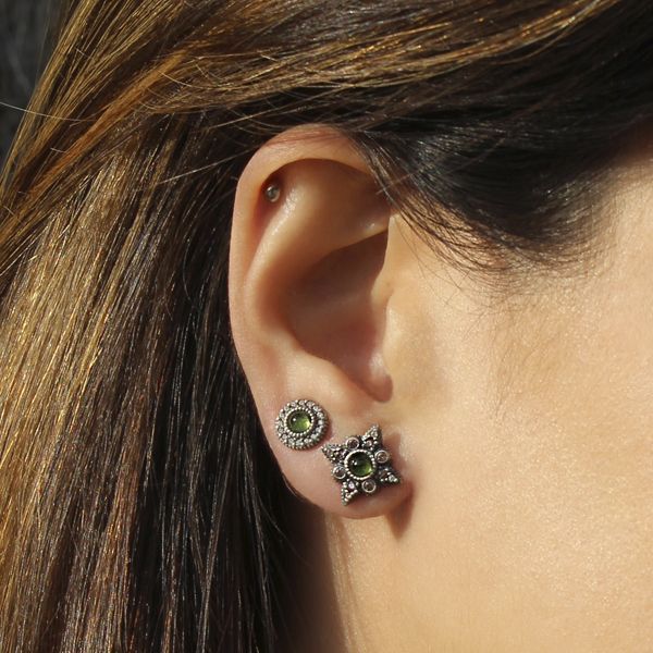 Los Classy de Sunfield se han convertido en la gama de esenciales que cualquier Sunfield Lover tiene en su joyero. Son pendientes minimalistas y sencillos que apuestan por la sofisticación atemporal. Fabricados en plata de ley 925 con acabado envejecido de 8 mm de diámetro con un cabujón liso central de peridoto rodeado de circonitas champagne talla brillante.