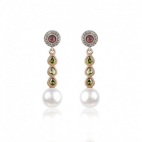 Con la colección Honey Moon sacamos a relucir nuestro lado más romántico pensando en las novias Sunfield Lovers que aman las perlas. Como resultado tenemos unos pendientes que evocan equilibrio, carácter i sofisticación. Fabricados en plata de ley 925 con acabado envejecido y con baño de oro rosa de 18 k combinan, de arriba abajo, un cabujón liso de turmalina rosa rodeado de circonitas champagne talla brillante, tres circonitas peridoto talla lágrima y una perla cultivada.