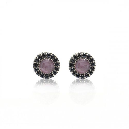 Pendientes de fondo de armario de diferentes colores para lucir en el día a día. Fabricados en plata de ley 925 con acabado envejecido de 10 mm de diámetro. En su centro luce un precioso cabujón facetado de turmalina rosa rodeado de espinelas negras talla brillante.