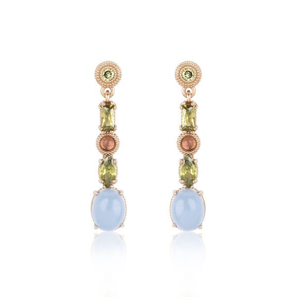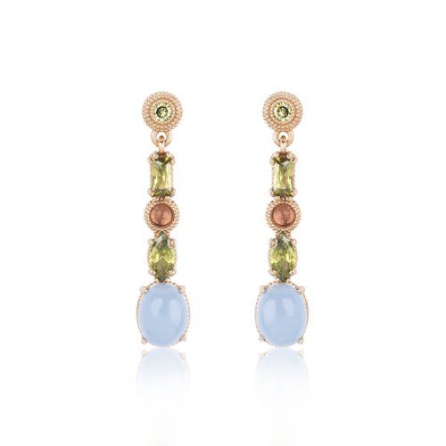 Los pendientes Moncayo de Sunfield reflejan la conexión con la naturaleza, con nuestras raíces más salvajes y la búsqueda de la eterna belleza efímera. En este caso se trata de unos pendientes fabricados en plata de ley 925 bañados en oro rosa 18 k de 39 mm de largo. De arriba a abajo lo componen una circonita peridoto talla brillante, otra talla baguette, un cabujón liso de turmalina rosa, le sigue otra circonita peridoto talla marquise y por último un cabujón liso oval de calcedonia azul.