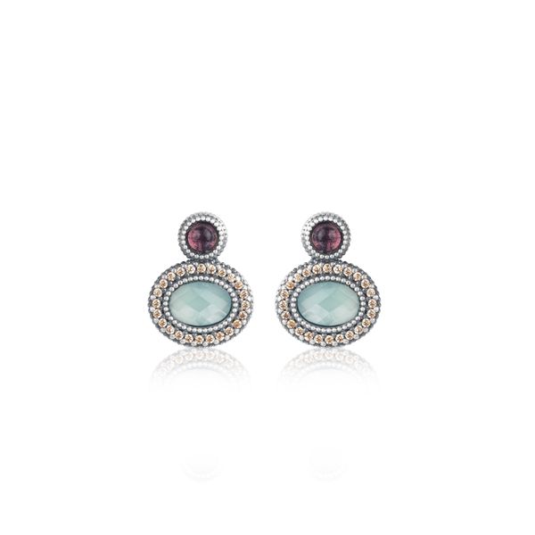 Los pendientes Zahora de Sunfield vienen con una clara influencia romántica y vintage. Están fabricados en plata de ley 925 con acabado envejecido de 15×12 mm con un cabujón facetado oval de calcedonia rodeado de circonitas champagne y con un cabujón liso de turmalina rosa en la parte superior.